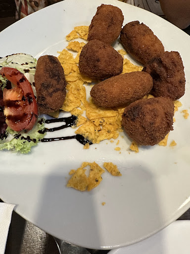 El pan, pffff… el común :( Las croquetas mixtas, si es el caso, me alegra la honestidad de que no pusieran la palabra “caseras” en la carta. Las de jamón, con esencia de, nada más , ni tropezones ni un sabor a jamón a destacar, estándar. Las de cecina eran como un purecillo médio grumoso cuyo empanado se separaba del contenido, todas ellas muy uniformes, estándar industrial. El emplatado en mi punto de vista, no aporta nada los nachos/Doritos y sobraba totalmente echarle sal por encima a las croquetas. Sobre el cachopo Clásico , la carne de baja calidad, de sabor dudoso…. El queso normalito, así como el jamón. El preparado, pues había partes que ni con el cuchillo chuletero le entraba, seguro que la carne estaba ya algo seca y con el aceite, la fejó totalmente tiesa. Igualmente sobraba echarle sal por encima del cachopo, ya con el jamón cocinado y demás…. Aunque me temo que para encubrir el sabor de la carne. En la mesa, de Astúrias, ni el agua. Esperábamos bastante mejor y tienen mucho que mejorar, principalmente en cocina, quizás haya sido un mal día, pero muy poco probable...