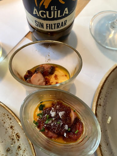Elegimos tomar el menú degustación, un menú cerrado de entrantes y que eliges un segundo. Pedimos 5, pero el camarero debió de apuntar 4 y llegaron todas las raciones desproporcionadas y a destiempo. A su vez, faltaba un entrante, del cual no fuimos informados y lo reemplazaron por otro sin comunicároslo. Cada vez que nos dirigíamos a los camareros para expresarles los inconvenientes, la actitud en todos ellos dejaba mucho que desear. Mucha falta de comunicación y empatía. A la vez, a parte de llegar a destiempo, había problemas en el emplatado (foto), los platos no estaban finalizados. Decidimos ya no expresar esto a los camareros para evitar recibir una respuesta no correcta.