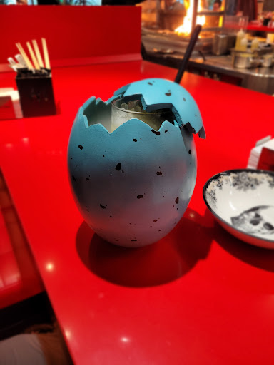 With its deafening music, the ambiance reminded me of a gay sex club: dark corners, padded walls, swings, plastic refrigerator curtains to separate the hallway from the main room where all the real “action” happened. Other areas attempted to replicate a hyper-exaggerated alley in Tokyo, replete with illuminated street signs, or private hookah lounges. The kitchen was reminiscent of teppanyaki dining but in the quietude of a wind tunnel. It was laughable to the have the servers try to explain the intricacies of the dishes and drinks when they themselves could hardly hear over the tumult. Such tasty irony.