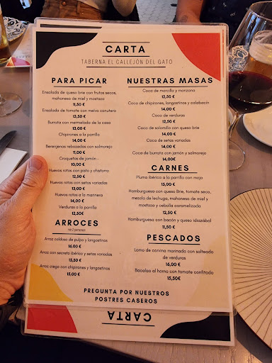Read moreLa Taberna del Callejón del Gato, ubicada en el barrio de Pacífico, tiene una historia curiosa. Se dice que su nombre proviene de la pequeña callejuela en la que se encuentra actualmente, donde vivían varios gatos muy pintorescos. Los platillos para picar son deliciosos. Las croquetas de jamón son cremosas y caseras, una auténtica delicia. Otra opción fantástica es pedir una coca para compartir mientras esperas el plato principal. Nosotros probamos la de verduras y nos sorprendió gratamente. La masa estaba crujiente y las verduras estaban en su punto. Para el plato principal, pedimos una paella de secreto ibérico y setas variadas. El arroz estaba cocinado a la perfección y la carne estaba jugosa y fresca. Terminamos la comida con una tarta de queso, que estaba realmente rica y cremosa. El personal era muy amable y atento, éramos muchas personas en la mesa y nos traían...