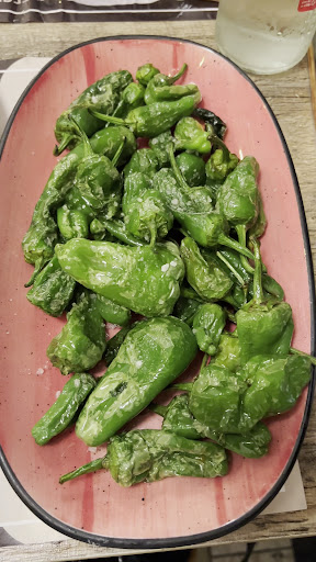 This place is perplexing! It’s always busy, has a lot of reviews, and is full of locals, however I thought the food was average. I’m not sure if we’ve been super lucky up until this point and have just been eating at the best places or if we just caught the chef on a bad night but I didn’t love anything. They only have full racions which was fine, just a lot of food. We got patatas bravas, which were huge chunks of potatoes that were a bit soggy and the sauce wasn’t really that flavorful or spicy. We got pimentos de predron which were your standard peppers, and a tortilla de patata with jamon which was not great compared to the others I’ve had in Spain. My husband got the paella which was kind of grey in color (can’t tell in the photo bc the light was reflecting off yellow window shades) and had quite a bit excess liquid, overall the flavor of that paella was okay. The servers were HUSTLING all night and I give them a lot of credit for serving the whole restaurant themselves. This place reminded me of the Spanish version of an...