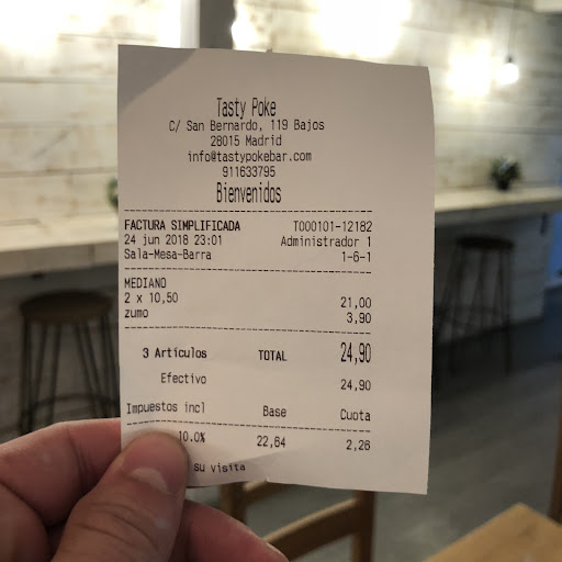 Tasty Poke Bar se encuentra entre San Bernardo y Quevedo. Con un local pequeño, distribuido con una barra en la que están todos los ingredientes a la vista y una pizarra en la parte superior con desglose de precios, pokes preelaborados.. En su interior, ambiente hawaiano con detalles en madera y colores vivos. No dispone de muchas mesas. No obstante, gran parte de la clientela de este tipo de locales acude para Take Away o a domicilio.