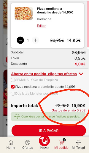 Read moreVivo a 5 minutos en coche u 8 andando (según Google Maps), pues una vez un pedido que era para las 22:00 llegó sobre las 00:00 y no te llaman ni para avisar, te toca encargarte de llamar pasando por una centralita que te pasa con la tienda y ya en tienda te cuelgan o te contestan la que atiende o la responsable de malas formas repitiendo siempre "pues acaba de salir el repartidor". Ese día la excusa fue que habían robado al repartidor la moto, motivo que me creí e incluso empaticé con él, pero viendo que casi siempre es la misma dinámica de una hora de retraso está claro que algo falla. Supongo que con la cantidad de fallos que tienen con los pedidos, cada entrega y su devolución se convierte en dos o tres entregas y más retraso para los nuevos pedidos. Pues después del supuesto robo de la moto y pese a vivir cerca del Telepizza, desde hace poco cobran unos gastos de envío de 0'95€, como si el precio de las pizzas fuera barato, por algo como zona peligrosa o algo así me dijeron. El caso es que ese cobro de gastos de envío no repercute en un mejor servicio en el cliente. Entonces ahora decidimos ir a por la pizzas y la última jugarreta ha sido que al pedir dos familiares especialidad el jueves 07/11/2024, una de ellas en vez de ser una pizza cuatro quesos con ternera nos metieron una pizza fría de los Family Days de un ingrediente (carne). Está claro que SI PAGAS CON CACAHUETES TENDRÁS MONOS POR EMPLEADOS y su servicio será el que es en este Telepizza, mediocre y engañoso. Muy buen ejemplo e imagen la que dan de Telepizza...