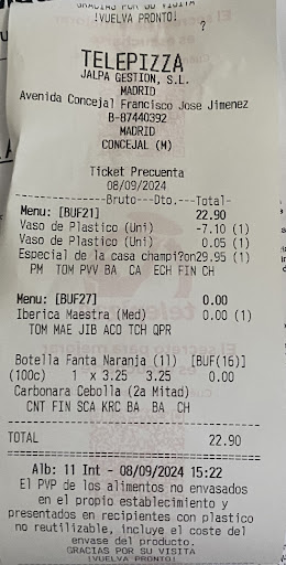 Read moreNo han sido puntuales, 30 minutos de retraso. Tampoco han llamado para avisar, he llamado yo y he conseguido que me atiendan a la cuarta llamada. Recibo la pizza, caja de mediana y pizza de 5cm de borde, literal. Pagar una mediana pero comer una individual. No me ha dado tiempo a sacar foto porque el repartidor aún no había arrancado la moto y he podido alcanzarle. Hemos chequeado la pizza juntos. El mismo repartidor me ha indicado como proceder para recuperar el dinero, teniendo que llamar de nuevo a la tienda, otras 3-4 llamadas hasta que han vuelto a atenderme. Desde tienda me dicen que en 2-3 días debo recibir el dinero y que si no lo recibo, tengo que ir a la tienda a reclamarlo y me lo dan en efectivo, siempre y cuando demuestre que el pedido no me ha llegado. Le pregunto que cómo puedo demostrar eso de que no me ha llegado una pizza (que tampoco es el caso, porque sí que me ha llegado, tarde, sino que no estoy conforme) ya que es la primera vez que oigo semejante cosa. Parece que ella misma se da cuenta de que su respuesta es absurda modificándola a que debo demostrar la operación mediante justificante. Resultado: llegan tarde, no avisan, no comunican bien, el dinero parece que también va a tardar, eso si no me toca tener que ir a tienda, donde desde ya dejo claro que pondré correspondiente hoja de reclamaciones, recupere el dinero o no, porque es lo que estos franquiciados (JALPA GESTIÓN SL) merecen por el servicio prestado. Y es que no es la primera vez, hubo una anterior diferente que dejé pasar, pero no va a haber...