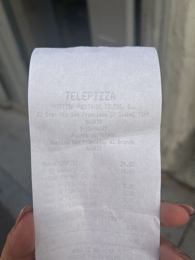 Llamamos a la tienda de puerta de Toledo y nos contesta una tal Sasha o como se llame que la chica es una borde porque va de chula diciendo q su nombre no se dice así , y le explico que tengo después de dos horas a dos críos de 8 y 10 años llorando porque el repartidor no ha querido dejar la pizzas y lo más normal es por gesto comercial después de 2 horas dejen las pizzas y ya ven como las cobran …