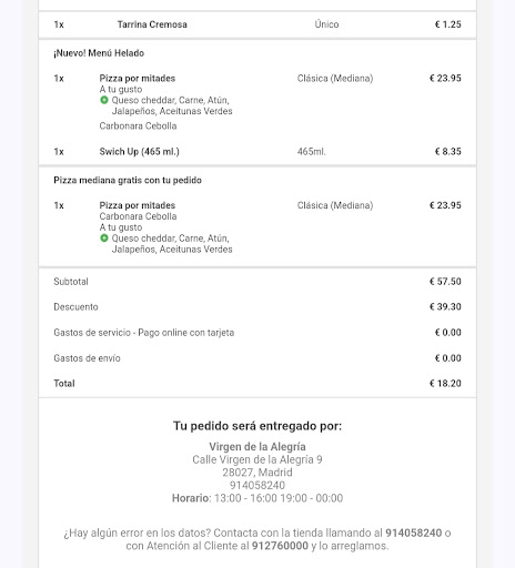 Read moreLas pizzas eran más pequeñas de lo que deberían y llevaban poquísimos ingredientes. Al decírselo a la chica que me atendió para darme mis pizzas frías, me dijo que ese era el tamaño y que las horneaban todas en la misma red. Aunque se horneen en una red o otra red pude sobrar red (puedes hornear una pizza pequeña o mediana sobre una red familiar). Lo peor fue que trataba de ignorarme y respondía escuetamente a mis preguntas y me sentí bastante impotente ya que iba con prisa y no pude poner una reclamación por escrito. Ojalá me pudieran dar una solución. La vez anterior aunque se supone que cierran a las 00:00 a las 22:50 me llamaron para decirme que fuera ya que cerraban a las 23. Tuve que correr para recoger mi pedido. No me volverá a pasar nada de esto porque no voy a pedir más aquí.