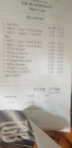 Read moreNi se molestan en mirar que es el contenido del pedido realizado, no es la primera vez que realizo envĂo para casa y me envĂan la comida como les da la gana ademĂĄs de llegar en mal estado SIEMPRE (frĂo y duro, sin ser culpa de la plataforma como ellos tienen la cara de insinuar puesto que el pedido llega en un tiempo minimo, sin tardanza alguna, pero si el producto que entregan lleva hecho horas normal que venga frio đ) Puedo entender el fallo en este ejemplo (que falte la lechuga, ya que he modificado algĂșn ingrediente en la hamburguesa) pero pides unas patatas con baicon chedar y ni rastro del baicon y chedar? No concibo que una hamburguesa que cuesta 8⏠sin patatas ni bebidas llegue en estados tan pesimos y ya que pagas 4⏠por unas patatas de cantidad mĂnima que mĂnimo que enviarlas reciĂ©n hechas y no unas que llevan 8 horas hechas. DespuĂ©s de ello gracias por trabajar tan mal porque por lo menos el dinero me lo han devuelto y encima he cenado gratis aunque en lamentables condiciones y recalentado todo (patatas en la basura...