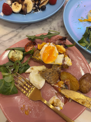 We ordered eggs Benedict and pancakes with Nutella. Eggs Benedict are definitely not eggs Benedict. It’s two halves of a dry bun, eggs that resemble hard boiled eggs more than poached eggs (not runny at all), it was dry and flavorless. On top of that, my egg was covered in plastic foil?? And the sauce was poured over it. The pancakes were burnt and not very tasty.