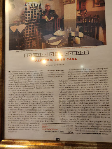 Read moreFui a la trattoría atraido por los buenísimos comentarios y porque quería disfrutar de auténtica comida italiana. El lugar muy acogedor, apenas 6 mesas para unos 20 - 25 comensales...como en familia. Alfredo, muy atento, nos leyó la carta y había algunos platos de un menú, que al parecer elaboraba diariamente. No hay pizza ni ningun otro plato tipo lasagna o canelones.....para disfrutar de esos platos había que avisar con antelación (detalle que no conocíamos) Pedimos burrata con mortadela de Jabali, albondigas de mero, carbonara, jumbo ( con langostino grande) y pasta con berenjena y verduras. La burrata exquisita, las albóndigas de mero, solo sabían a harina, las carbonara....bastante decentes, pero se le fué la mano con la pimienta, la pasta con berenjena, sin más.... y la pastan Jumbo, la verdad..... no quiero decir que estuviera mala, pero el Langostino estaba muy pasado de cocción y estaba chicloso, y la pasta que eligió, creo que no fué la mas acertada....y en general, las pastas...no estaban al dente....estaban bastante duras. Quizá ese día no fué el más adecuado, quizá, otros días esos mismos platos están exquisitos, pero yo no me llevé esa sensación.... nos recomendó un vino "Moro" , siciliano, que la verdad, estaba muy bueno.... pero lo demás.... para haber pagado casi 180 Euros.... no me pareció acorde lo pagado con la calidad y el sabor...