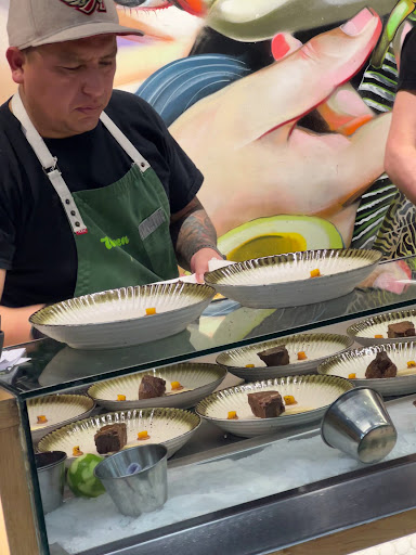 Add ons dishes . In my opinion there’s no need for them when what you offer it’s a tasting menu. Have an option A with 6 courses and a option B with 8 , with some premium products like oysters if you want, but don’t have the staff table by table suggesting that the signature dishes are outside of the tasting menu. And they need to be ordered before the start of the meal. When you don’t know about portion sizes . Also suggesting that one shouldn’t worry about quantity, it’s chill to add them, as it’s not much food. This is oversell and this is wrong. There’s enough food on the menu to leave the place really full. The couples on both our sides ordered two extra dishes on top, on the premise that it wouldn’t be too much food, and were really struggling by the end of the night. Music. Very loud and Electronic upbeat. I don’t know if the staff put a playlist to prepare everything , but we seemed to be in the so called “Ruta del Bakalao” for a great portion of our meal. Not the best for dinner in my opinion. Then they changed to what I think it was something more Peruvian and it was great.