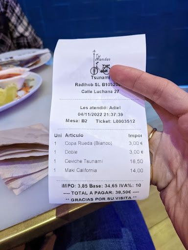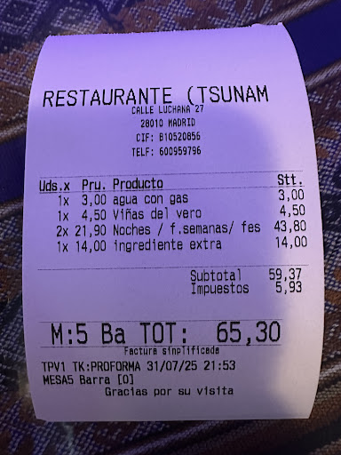 Dejamos 14 piezas en el plato porque simplemente eran incomibles. Se lo explicamos al camarero con educación, esperando al menos algo de comprensión. Fue a consultar con cocina y volvió diciendo que “todo estaba bien” y que, por norma de la casa, nos tenía que cobrar 1€ por cada pieza sobrante, lo que se tradujo en 14€ extra en la cuenta. Lo podéis ver en el ticket: 43,80€ por las dos barras libres, más bebidas y el cargo extra. Total: 65,30€ por dos personas. ¡Y salimos con hambre!