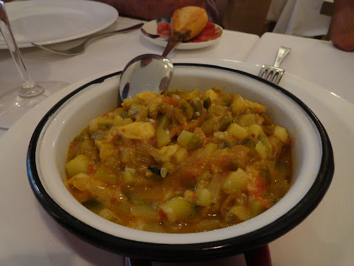 Es el plato estrella del local y no tenemos muy buena suerte pues el día está super desapacible (frío y lluvia), lo que ha hecho que todo el mundo pida cuchara. Consiguen sacarnos una media ración que aparece en dos cuenquitos. El potaje está como par lamer el cuenco, la cacerola y todas las cucharas que hayan tenido contacto con él. Brutal. Entendí el enfado de un señor sentado en una mesa cercana que venía expresamente a comer eso y ya se reviró al saber que no era posible. Ojo, que le sacaron el poco caldo del guiso que quedaba para intentar disipar su enfado.