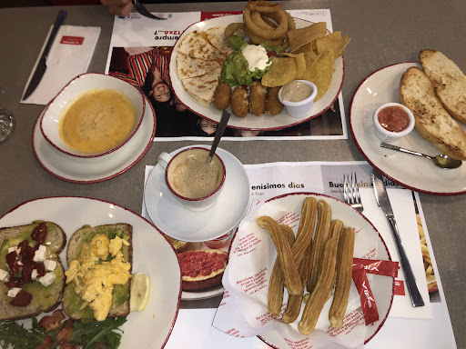 In all honesty I’m not sure why this place is always crowded. The food was okay and our service was terrible. As a non native spanish speaker I was trying to communicate the best I can but our server kept giving me attitude when I couldn’t understand what she was saying. Also, I had to go and find my own English menu from around the restaurant. As a touristy place it’s not unexpected to have non spanish speakers. My boyfriend ordered the pancakes that looked absolutely nothing like the picture or description and they were out of syrup which would have been nice to know before ordering. I got the burger which was nothing spectacular, but also wasn’t particularly bad. However, we received our food at least 10 minutes before our drinks got to the table, despite asking for them multiple times. I will not be coming back here and if you’re looking for somewhere to eat in Madrid, despite all the lines, Vips...