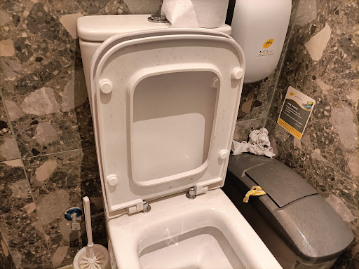 Como se puede ver en las fotos, la capa de arriba era el arroz que estaba muy duro y seco, era lo pegado del fondo de la olla, era imposible masticarlo, de tomate sólo una cucharada para tanto arroz, el plátano un trozo ridículo y súper aceitoso, el huevo frito pasado sin yema, y todo el plato frío por completo. Frío frío no templado. El salmón a la plancha seco, muy pasado, se hacía"bola" al masticar, véase la foto, los laterales del salmón no se pudieron comer, y el arroz que lo acompaña durísimo. Sirvieron los primeros platos de 2 menús pero la hamburguesa que pedimos a parte tardó 25 minutos en llegar, haciendo esperar al comensal mientras los demás comíamos para que no se nos enfriase aún más si cabe nuestros platos, la hamburguesa estaba en la barra de la cocina hacía tiempo pero nadie nos la servía con lo cuál llegó fría, la pedimos al punto y estaba muy hecha, más bien seca. El huevo de la hamburguesa del menú también llegó sin yema y casi quemado, ver fotos. Además sirvieron los segundos antes de acabar con los primeros, con lo cuál también se quedaron fríos los segundos. Un desastre de organización entre cocina y sala. Al expresar nuestro descontento con la comida, el tiempo de espera y la organización nos dice la camarera Enma que allí cada semana cambian de personal. Lo más inaceptable fue el estado de los servicios. Ver fotos (ojo! no aptas para personas sensibles, ni para el resto tampoco diría yo...) Repito que eran las 13:30h el local acababa de abrir y se vé claramente que no se limpiaron los servicios antes de abrir. El servicio de señoras con la taza entera salpicada de excrementos, papeles y demás objetos de higiene femenina tirados, suelo pegajoso, el lavabo con restos de comida y pelos, no había papel y fuí a buscarlo al baño de discapacitados que estaba aún peor de suciedad, no había jabón en ninguna de las jaboneras. La segunda vez que entro al baño, me encuentro con la camarera de la barra que sirven postres y bebidas, cogiendo una bola de papel higiénico y pasándola por la taza del váter, sin guantes, sin ningún producto desinfectante, sin bayeta, sólo una bola de papel para "limpiar" la taza. Después salió de los servicios y se fue de nuevo a la barra a preparar nuestros postres, espero que se lavara las manos porque no daban crédito mis ojos! Lo único correcto fue el postre, aunque que ya me lo comí sin ganas después de ver que lo preparó la camarera de la barra que vi limpiando el váter.