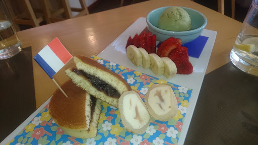 Dessert included rhubarb crumble with custard cream and green tea ice cream with mochi and dorayaki. We couldn’t decide which we liked better, because both were so delicious, so we just shared them and ate both!
