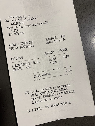 Read moreHe ido a la tienda para comprarme algo para cenar. Tras echar un vistazo a toda la comida (nada tenia buena pinta, la verdad...) decidí preguntar de qué era la salsa de las "Albondigas en Salsa", y para mi sorpresa la dependienta me dice "no lo sé, esta comida nos la traen hecha"... Alucino, la verdad. No sé ni por qué las he comprado. Además, salí de allí con la sensación de haber hecho una pregunta tonta, porque la señora me hablaba y se reía como "esta chica es tonta" "Pues, la típica salsa de las albóndigas", me decía. Lo siento, ni sé, ni tengo por qué saber de qué suele ser la salsa de las albondigas. Este tipo de negocio existe gracias a quienes no cocinamos, no queremos cocinar, no sabemos recetas, o no tenemos tiempo/ganas de cocinar. Afortunadamente no tengo alergias ni intolerancias, porque claramente informan más bien poco. Las albondigas no estaban buenas. Es la segunda vez que compro comida aquí y me arrepiento, dudo que vaya a repetir. No...