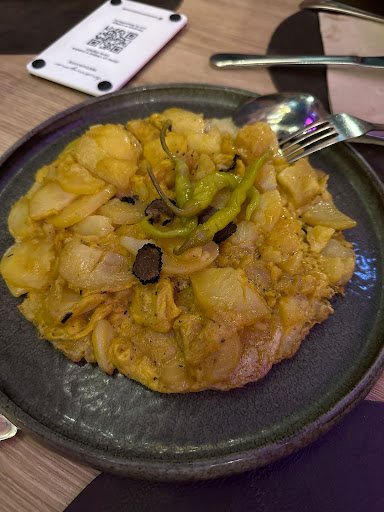 Estábamos ubicados en la terraza, congelada claro… porque encender los calentadores 15 min antes no es posible (eran las 15.00h!! Y con reserva). Hasta que terminamos los primeros con abrigos y frío. Y por cierto un PESTAZO A TABACO PORNOTROS COMENSALES FUMANDO EN EL RECINTO…impresionante… como sabrán la normativa PROHIBE permitir fumar en terrazas CERRADAS. Pues nada, comiendo con humo de tabaco y con frío… fabuloso. Las bravas ricas pero de bravas nada. No pican ni por asomo. La tortilla fría, insípida y muy cuajada. Las alitas saam absolutamente terribles, ni sabor, ni aroma ni NADA. Hacía tiempo que algo me parece MALO…. una alita sobrecocida y rebozada insípida y hasta desagradable. El sweet chili se debió evaporar por el camino. 20 min espera y llega el salmón: aburrido sobrecocido, el escalope:suela de zapato y el steak tartar también absolutamente insípido, sin nada picante, sin sal, pffff al menos la carne olía bien y no ha pasada.