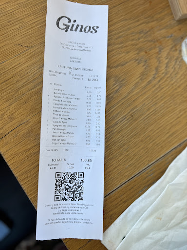 Read moreFuimos a cenar. Llegamos al local a las 22:50, y lo primero que nos dijeron era que la cocina cerraba a las 23:30, lo que ya auguraba el desastre posterior. Pedimos espaguetis carbonara y pizza vulcano formaggio. Se notaban ya las prisas y no nos trajeron las aceitunas de aperitivo. Pedimos una botella de agua grande que nos dijeron solo la tenían del tiempo y que nos pondrían hielo (a mi ya que me pongan hielo, que es agua de grifo congelada, cuando pido agua embotellada me parece un despropósito). Los espaguetis carbonara pasables pero fríos y bastante secos. En cuanto a la pizza un desastre. La masa totalmente cruda por lo que se lo dijimos al personal que procedieron a retirarla diciéndonos que nos hacían otra (aquí ya eran casi las 23:30). La siguiente que nos trajeron estaba casi quemada por arriba pero la masa seguía estando igual de cruda, por lo que tampoco nos la comimos. Cuando pedimos la cuenta el personal nos preguntaron si queríamos una caja para llevarnos la pizza y les dijimos que no, que la pizza no se podía comer porque la masa de esta pizza estaba también totalmente cruda. Por supuesto no nos cobraron la pizza, pero nos fuimos sin cenar. Ni que decir tiene que no pedimos el postre allí sino que nos fuimos a otro sitio y que por supuesto no volveremos. Ni fotos hice porque estaba ya asqueada. No pongo reseña cero porque el personal de sala no tiene la culpa. Hablo de este Ginos en concreto del Equinoccio porque para el Ginos de La Vaguada mi reseña es de 5 estrellas. A modo general en ningún Ginos los cortadores de las pizzas cortan, lo que debería ser algo...