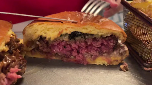 En cuanto a la hamburguesa, hablemos primero de los componentes. El brioche es un pan enriquecido con azúcar, leche, huevos y mantequilla típico francés. Al ser un pan dulce y esponjoso, es perfecto para el desayuno. La corteza es dorada y la miga amarilla. El que vino con la trufada estaba tierno, tostado y untado con una salsa que no es más que mahonesa con brandy y trufa. Era muy dulce, casi como un bollo suizo y no encuentro ninguna razón para que el azúcar aparezca en este bocadillo. Es sabido que están de moda dos de los ingredientes del brioche: el azúcar y la mantequilla. La razón creo que es lo saborizantes que son las grasas y los azúcares. En mi opinión no casan y son tramposos. Predominan y anulan a la carne. Lo que es una pena porque la carne de la hamburguesa vino cocinada al punto requerido, con un buen balance de grasa y un tamaño y forma muy correctos.