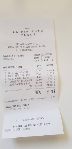 Opinión anterior. Conozco El Pimiento Verde hace más de una década y siempre ha sido uno de mis restaurantes favoritos de Madrid (c/ Lagasca antiguo y nuevo). El nuevo de Majadahonda hemos ido en dos ocasiones, la primera al inaugurarse (primer sábado) y la segunda ayer (reapertura tras covid). Niguna de las dos veces ha estado al nivel esperado, pero sobretodo la de ayer noche (la primera pensamos que era nuevo y había que darle un margen trato bueno, alcachofas buenas, chipirones encebollados sabor quemado y rape normalito). La de ayer, para ser justos, empiezo por lo bueno: El personal muy agradable y atento, el local bien preparado, gel a la entrada, límpio, buen aspecto y con suficiente distancia entre mesas y las flores de alcachofas excelentes como siempre. Lo malo: 1) en primer lugar el vino, un Luis Cañas caliente. Se lo digo, lo comprueban y vienen a decirme que la cámara está estropeada, opto por tomar una copa del vino que tienen en barra (excesivamente frio) y mi mujer se queda con la cerveza, creo que esto es inaceptable en cualquier restaurante. 2) el sapito/rape regular tirando a mal, bastante chicloso y demasiado vinagre, y las patatas cocidas de acompañamiento duras, incomibles (con lo que le gustan a mi mujer!!!!). Para evitar confusiones indico que este menú lo hemos comido en el Pimiento Verde decenas de veces en los más de 15 años. La situación nos ha defraudado, primera escapada tras covid y vaya chasco!!! se nos ha quitado las ganas de café, postre, etc... una pena. Cuando viene la nota comentamos estos temas y llaman al responsable, que viene, amable, reconoce lo del vino, también dice que el plato de rape huele bastante a vinagre (incluso con mascarilla) y se disculpa, agradece los comentarios y se lleva la cuenta para hacernos un detalle. La cuenta baja de 75€ a 51€, lo cual se agradece mucho, pero la verdad no compensa este segundo chasco, no es un tema económico, sobretodo después de tres meses sin salir a cenar fuera. Dejar claro que esta reseña negativa me está costando mucho, porque El pimiento Verde ha sido para nosotros uno de nuestros restaurantes "de cabecera" para celebrar nuestras cosas, no sé ni las veces que lo he recomendado a amigos y familiares!!! Se me ha...