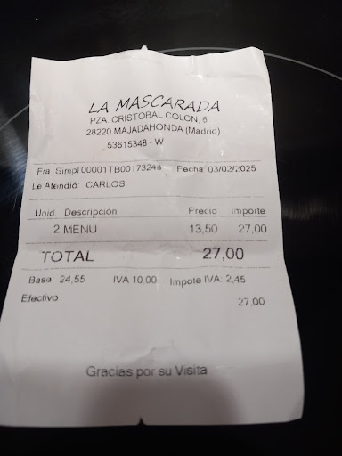 Read moreEs un lugar que no suelo ir más que de cañas en verano, ya que alguna vez que hemos comido, el menú del día no nos ha convencido. Hoy que iba con mi hijo, nos pasamos a ver el menú del día de los restaurantes de la Plaza Colón. El menú de La Mascarada en la pizarra convenció más los gustos de mi invitado, por lo que yo accedí a entrar. De 1ero yo me pedí el Puchero de garbanzos y boletus y él unos tallarines Alfredo. A los garbanzos les faltaba cocción, estaban duros y el caldo estaba aguado y sin sabor. Aunque no probé los tallarines, me pareció que tenían exceso de nata. De 2do pedi un entrecot punto+ y él una pechuga de pollo. Me sirvieron una tira de carne de unos 5 cm de ancho x 12 cm de largo cortada, pasada de punto y seca. Quizás el pollo era lo que menos peor estaba de todo. Y ya para rematar esta jornada gastronómica, me sirvieron un café con leche que venía con una avispa "submarina". Algo muy desagradable. Me levanté a decírselo al responsable en el interior del restaurante. Pareció darle poca importancia, diciéndome que seguramente el "bicho" habría caído por accidente en la pila de las tazas. Se limito a decirme "lo siento". Se conoce que los controles higiénicos sanitarios en este restaurante brillan por su ausencia. Dudo mucho que tengan implantado un sistema APPCC obligatorio en los estabkecimientos en los que se manipulan alimentos. El servicio poco profesional, pareciera que estuviera en su casa. Recogió la mesa de los comensales anteriores, limpiando las miguitas con los dedos sin bayeta ni líquido sanitizante, la paso después. La terraza tiene unos calentadores eléctricos que si tienes uno cerca te achicharras. Teníamos dos, uno por cada frente, de otras mesas. Una experiencia que no se la deseo a nadie.Desafortunadamente, no llevábamos el móvil para hacer fotos para que constarán los detalles. No...