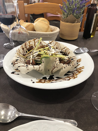 We drove through the town and stoped at this restaurant, we are English speaking, so a bit hard to understand the menu, but the food we ordered are very well balanced. The mushroom risotto with pork chop is the best! The pork steak is thick cut with black salt. And the Cesar salad is the first dish we had in Spain with green vegetables ( besides asparagus). The hams and cheese boards are also very good, authentic. We visited many fine restaurants in Madrid, Valencia, Sevilla, etc, this meal can be...