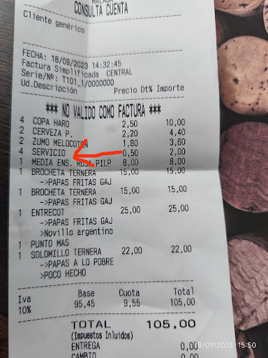 Otro punto, si me vais a cobrar el servicio en la propia cuenta, que sepáis que eso es ilegal. Os recomendaría que cambiases el concepto por pan o cubiertos y lo indiquéis en la carta para que si sea legal.