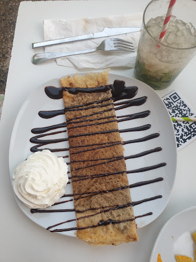With the sea front only 10 m away surrounded by various bars this bow tastic food fresh fruit juices and lots of desserts also a great place to sit and take a drink and watch the people walk bye