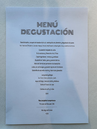 En mi caso concreto elegimos dos menús “singles” y como veníamos de Coruña que son 45 min en coche (+ 2.50 euros de peajes =5 euros) yo decidí no beber, por lo que tome una copa de vino al empezar y luego una botella de agua, mientras mi padre que íbamos a celebrar mi cumpleaños pidió una botella de vino. Detallo el menú a continuación: • Degustación de panes: Nada más llegar, te ponen, pan de nueces, pan de té negro y pan del país. (A mí me falto que pusieran algo de aceite aunque ponen mantequilla). • Aperitivos: Empanada, croquetas, cebollita con mousse de sardinilla y mantequilla (Aquí lo único que destaco por originalidad fue la cebollita con mousse de sardina) lo demás no me parecen aperitivos de menú degustación de un estrella Michelin, vaya en cualquier bar gallego te lo puedes encontrar. Le daría un 6 a todos los platos de aperitivos. • Espárragos blancos de temporada en su crema y ensalada cítrica de tirabeques (Eran unos espárragos blancos de primera calidad) en mi caso que no me gustaban a mí me pusieron Coliflor del país asada y caviar, estaba muy bueno pero no fue un plato que me sorprendiera le daría un 6. • Guiso de calamar y chicharro de Betanzos (calamar ultra picado que tenía mucho sabor y guisantes un poco duros de Betanzos… este plato no me dijo nada). Un 5. (Lo eliminaría del menú) • Xarda en escabeche, este plato lo saco el chef a mayores de lo que venía en el menú para probar y tengo que decir que para mí fue el mejor plato de la carta un 9 le doy, es escabeche estaba delicioso • Huevo de Maruja Limón… si tiene el aquel de que es un huevo escalfado presentado en forma de croqueta, creo que no es un plato del nivel de este restaurante por lo que para mí es un 5. (Lo eliminaría del menú) • Viera y parmentier de champiñón, plato con un calidad de viera increíble y a mi la crema de setas me encanta, así que un 9 , mantenerla por favor, exquisita. • Rodaballo y consomé de hierbas, era un buen pedazo de rodaballo (Aunque de piscifactoría) y estaba rico un 7. • Estofado de Rabo de Vaca, a mi particularmente no me entusiasmo, un 6. • Cerezas, sorbete de frambuesa y mousse de Remolacha, a mi particularmente no me gusto la remolacha, pero estaba bien ejecutado y lo demás me gustó mucho un 7. • Tarta de Chocolate y Naranja con una onza de chocolate blanco crítico, es un postre de 9