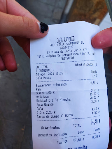 Read moreEl peor trato y nula profesionalidad que he visto en un "camarero" (lo entrecomillo por no desvirtuar la profesión...). En cuanto a la comida en si: las croquetas de marisco y los gambones a la plancha, buenísimos. El filete y la lubina muy mejorables (no puede admitirse que el vinagre de la ensalada de guarnición acabe empapando lo que quieres comer). Y, de añadido, un robo cobrar 25 euros por 2 rodajas de lubina (que casi fueron 28 por el enésimo error del "camarero"). Sólo éramos 3 personas. Se olvidaron traer un refresco, hubo que llamarle para recordarlo. Pedimos una botella grande de agua, la traen y a los 10 minutos seguíamos sin tener vasos (también los tuvimos que pedir). Pero lo más penoso es que pedimos 1 entrante y 3 platos (hago hincapié en que éramos 3 personas), detallando lo que queríamos cada uno, y entre el plato de mi pareja y los otros 2 platos pasaron, de reloj, 35 minutos (y también hubo que reclamarlos). Y, al hacerlo, el señor que nos atendió de malos modos desde el principio, dicho sea de paso, se justificó diciendo que lo de mi pareja era un primer plato y lo demás un segundo plato!!!??? Lo dicho, la peor experiencia que he tenido en un restaurante. Seguro que en los días que nos queda en Malpica encontraremos sitios donde ser atendidos muchísimo mejor. Tan seguro como que no volveremos a ese sitio en...