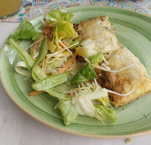 Read moreEl restarante esta en una esquina muy ruidosa,no hay ninguna terasa Asique es un sitio poco acogedor i nada comodo por los coches pasando al lado.El camarero es muy simpatico i amable PERO SOLO CON LOS MALLORQUINES! Ya que hablando en otros idiomas su amabilidad se esfuma,por pedirle cambiar de mesa casi se enoja.En el menu no hay ni una sopa,no saben preparar una sopa miso i nisiquiera hay unas tristes lentejas.Tampoco encontrareis en menu comida"tradicional vegetariana" como Frito sin carne o sopa de verdura. Y tampoco comidas clasicas vegetarianas como trigo saraceno o panir o puri. Nada de eso. Nos han traido pizza QUADRADA con la massa super dura y ensalada con piel de calabacin(disfrutad de la foto). Los macarrones con feta y verduras que a mi me daria verguensa enseňar este plato y el risotto con aros rojo y CACAO! en la carta ponia que tiene algas,pero no he visto ninguna. Por mucha ambre que teniamos abandonamos los platos casi llenos.No tomamos ni servesa ni vino solo dos limonadas y toda esa "maravilla" de comida nos costo 35€. Camarero ha visto perfectamente que no nos ha gustado y que?Le importa un... (Con la misma situacion en un restaurante chino nos han devuelto dinerro y el dueño ha sido de lo mas simpatico con el niño)Una enorme desepsion ,porque la comida vegetariana esta super...