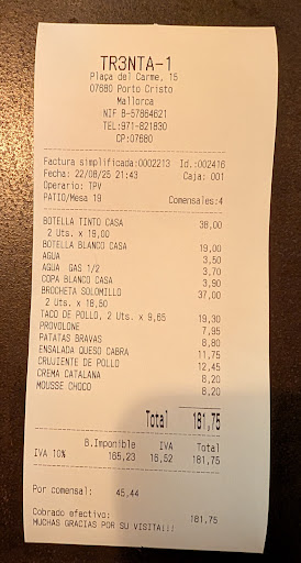 Read morewhen studying reviews of where to eat in Porto Cristo, Tr3nta-1 stood out from the rest, so me and the other half had to try it, we had langoustines, potatos bravas, crispy chicken with mustard, tuna tartare with avocado, the langoustines were just incredible, everything was just right, couldn't find fault with anything, the service was fast and polite, the location was great, considering we had so much to eat (seriously, 3 tapas might be enough for some couples, we had 4 and some bread), and we didn't leave a crumb, plus 2 beers, I was expecting a hefty bill 😕 it came to 42 euros 😮 100% best meal I've had anywhere in Spain. thank you guys...