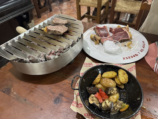 Read moreCada vez a peor. He cenado y comido varias veces en este asador y la experiencia siempre habia sido favorable, sin embargo, a ido descendiendo. Ésta vez hemos ido a cenar un grupo de 6 amigos y desde el minuto uno nos han atendido fatal. Nuestra camarera fue Sol y nada más sentarnos se nos acerca a la mesa y nos dice: "¡Vamos! ir pidiendo rápido que tengo más mesas que atender..." nos ha dejado a todos pasmados. Hemos pedido 3 entrantes para compartir. 1.Croquetas: no tenian sabor y se notaba que eran congeladas (no os las recomiendo). 2.Pulpo: riquísimo! Hecho a la brasa, muy jugoso y generoso en la ración. 3.Surtido ibéricos: de primera calidad. Luego como principales os recomiendo las costillas, el solomillo al foie o el chuletón de buey a la parrilla... en éste último te sacan la parrilla en la mesa y terminas de cocinar la carne a tu gusto. En contrapartida, el acompañamiento eran verduras congeladas que habian hervido en agua sin más, las cuales desmerecian el plato por completo. Los postres fueron un chasco... las raciones eran grandísimas pero mucho de algo malo no lo hace mejor... tarta de chocolate: terrible, seca, sin sabor... tarta de tiramisú: bastante mejor que la anterior pero aún así se notaba que era congelada porque la textura era malísima... flan de huevo nadando en sopa de caramelo.... y así podría seguir con la tarta de santiago, la tarta de queso o los profiteroles. Pero volvamos a la camarera... le pedimos que nos cocinara un poco más el entrecot y nos dijo: "me has dicho bien hecho y así está, pero si quieres hacerlo más, ponlo encima de la piedra" y para que nuestra amiga pudiera comérselo pusimos el entrecot en la piedra. No se preocupó ni una sola vez en preguntarnos si nos habian gustado los platos o si necesitábamos algo más. Al final le pedimos la cuenta y nos dijo que teniamos que ir a pagar a la barra porque era con tarjeta....y mientras en la mesa de al lado con el datáfono. Espero que mejoren el personal, que retiren la comida congelaga y que vuelvan a sus raices de comida de simpre. Las dos estrellas se las doy por la carne, el...