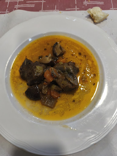 En el restaurante está en el centro de manlleu, con gente de la misma localidad. Pedimos ensalada variada, y verdura al tempura, de primero, la ración un poco escasa. Después de segundo carné estofada estaba buena, y en su punto, pero también escasa con poco zanahoria y rovellons y también poca carne tuvimos que pedir un poco más de carne, el camarero muy agradable nos dió dos trozos más, como se ve en las fotos. El postre muy buenos y cantidad bien, aunque siempre digo en mis reseñas qué poner una galleta en la crema siempre da un buen toque...