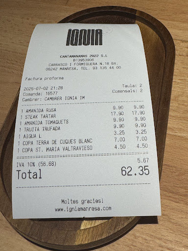 Read moreNou restaurant a Manresa. Amb l'experiència que tenen del restaurant La Barca de Monistrol es garantia d'èxit. La renovació del local ha estat perfecte, el bon gust i un toc de disseny és respira en cada taula. La coberteria, el vidre i la vaixella amb un gust exquisit. Hi vam dinar per Sant Jordi, un dia desbordant, ple de gent al carrer. També a l'Ignia no hi cavia ningú més. Amb un menú de 25,80€ pa i veguda inclosa ens vam asseure a taula 4 persones prèvia reserva. La meva experiència va ser molt bona. Sempre intento demanar plats creats a la cuina amb la "gràcia" del xef. Un peix o una carn a la brasa, si el producte és bo, no falla. Però un guisat o un plat amb elaboració, penso que és on es veu la cuina del lloc on estàs. De primer Steak tàrtar, ou de primera posta, foie gras i pa de brioix (supl.4€), una manera nova de presentació i preparació. La convinació genial, em va agradar molt. De segon, Arros de tataki de vedella i trompetes de la mort. L'arròs al punt perfecte i el tataki de vedella tendrissim, molt bo en convinació amb el sabor de les trompetes de la mort. De postres vaig demanar un partís de formatge. Presentació espectacular, tot ell folrat amb un cruixent que em recordava una mica a la xocolata blanca. Dues copes de vi negre Abadal D.O Pla de Bages. El servei molt amable, servicial i...
