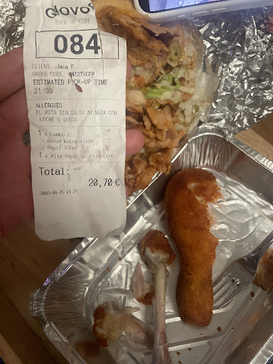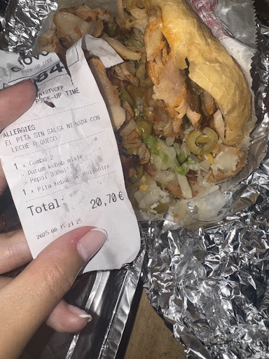 El problema ha sido que al llegar a casa he visto que se habían equivocado con mi pedido. Resulta que habían puesto olivas en mi pita cuando no las puedo comer, a parte de que me gusten o no... Les había dicho previamente que solo quería lechuga y nada más, ni salsas ni nada. He llamado explicándoles mi situación ya que quería cenar pita, sino no la hubiese comprado. Eran las 22:10 más o menos y se supone que no se puede salir. Me han dicho que me hacían la pita de nuevo o bien me la hacían otro día gratis. A lo que yo les he dicho que la quería hoy obviamente y que si podían traérmela a casa, a lo que el chico me dice que no porque tenían que limpiar a las 22:30 y a las 23h debían cerrar y estar fuera del restaurante, que al ser lunes funciona así la cosa. Mencionaba algo de una multa... Bien, al final he ido a buscar mi pita y lo que me he encontrado ha sido algo frío y escaso, como si fuesen las sobras de lo que les había quedado del día. Me siento muy decepcionada... La verdad. Otra cosa también es que cuando he entrado en el restaurante para buscar mi comida el chico va y me dice que es su culpa que lo siente por equivocarse pero que me "invita". Algo raro, una situación surrealista. Como si tuviese que pagar yo su error... No...