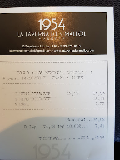 Read moreDescubrimos este restaurante al azar, dando una vuelta por Manresa. Comimos dos menús que incluían una crema de fredolics (negrillas), cocas de camarones, un plato de secreto ibérico con rovellons (níscalos) y unas costillas de cerdo con una base de pimientos ajoarrieros que me recordaba a mi ”peperonata” italiana. De postre pedimos un pastel de manzana y una crema catalana. El vino tinto estaba muy correcto, aunque algo frío a nuestro gusto, vistas las temperaturas exteriores. Todo estaba preparado con arte y delicioso. El servicio también estuvo impecable y en un local muy acogedor. El precio (18,50€) acorde con la calidad del conjunto. Un restaurante que...