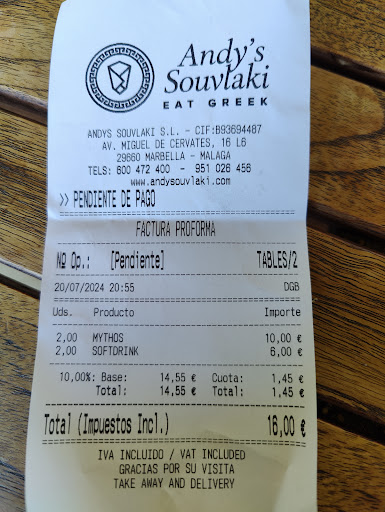 Read moreThe food here is not great, it's probably one of the worst meals I've had in the area. Dips brought out on a selection board to tempt you to order, when you order nothing comes with them?! So you have to wait for some pitta, which wasn't pitta it was corn bread before you can eat them, otherwise you're eating houmous and taramasalata with a fork! The food on the menu isn't all available to order if you sit in, some only for take away which is odd, it's actually more like a take away with a few patio tables outside, there is no real interior. Two veggie options only one can be ordered to eat in, a greek salad, which to be fair was my friend said was tasty. The pork gyros were tiny and the worst quality meat, full of fat with some lukewarm chips on the side. Chicken kebab as chicken gyros not available to sit in were the ready prepared cubes of chicken that you can buy in Aldi or Mercadona, tasteless, lukewarm, poor quality and served with some more cold chips. The bifteki was tiny with cold chips. Only one lady serving which isn't her fault, but this led to terrible service and long waits. Also there is a minimum spend per person of €20. If you want a kebab head to Smileys which is round the corner, you'll get faster service...