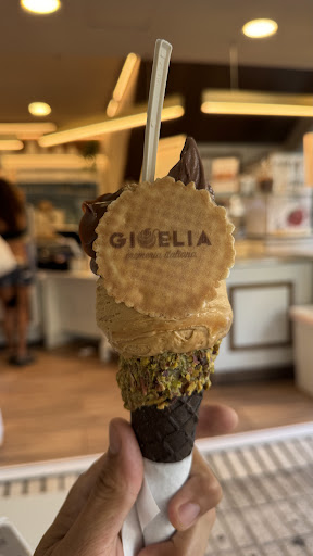 Gioelia in Marbella is an excellent spot if you are looking for real Italian gelato with a touch of creativity. During my visit, we ordered two gelatos and both exceeded expectations. The cones were not just the usual ones – they were made by chocolate and dipped in pistachio, adding an extra layer of flavor and texture that made the experience memorable. The flavors we chose were very well-balanced. One was mango cake with white pistachio, which was refreshing yet creamy, while the other combined dulce de leche with chocolate, a richer option. Both had a smooth texture, with no artificial aftertaste, and felt very authentic. The portions were surprisingly generous, with a very good ratio of gelato to cone, making it not only delicious but also satisfying. Another highlight was the service. The staff were genuinely friendly, attentive, and made us feel welcome right away. Their positive attitude really enhanced the visit and reflected the care they put into the place. Considering the quality of the ingredients, the originality of the presentation, and the generous portions, the price was excellent. It’s clear that Gioelia focuses on offering both quality and value. Overall, this was one of the best gelato experiences I’ve had in Marbella, and I would definitely recommend it to anyone...