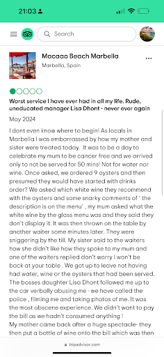 Read moreRIP OFF AND ADDING VAT TO THE MENU PRICES Food and environment is good, service was good. BUT, ridicously expensive and a total ripoff! When paying they claimed that service was not included and made me feel so bad that I gave 10% even though they already put a cover charge on the receipt. After leaving we checked the receipt again and noticed that they added 10% VAT to the prices in the menu, which is illegal according to Spanish law. We went back to claim this money, which I got after some arguing with the owner (she really knows that they are breaking the law, she gave up easily when confronted with the law text), and since I felt ripped off I also wanted the service charge back, which they refused to give. I wouldn't send my worst enemy here, not only for the ripoff but because they destroyed my last vacation day...
