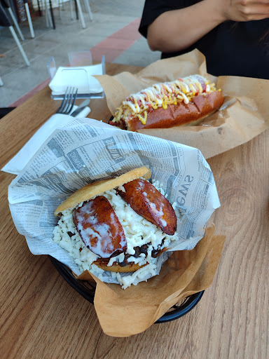 También probamos el perrito "calle el hambre" 🌭. ¡Impresionante! El brioche era súper esponjoso, con muchos toppings y un toque crunchy con las patatas paja. El maíz le daba un toque dulce que quedaba perfecto.