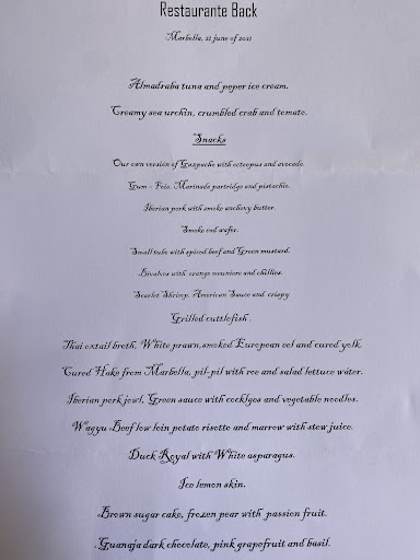 Our dining experience at Restaurante BACK in Marbella was nothing short of extraordinary. This restaurant, which recently received its first Michelin star, lives up to its reputation in every possible way. From the ambiance and service to the food and wine selection, everything was impeccable.