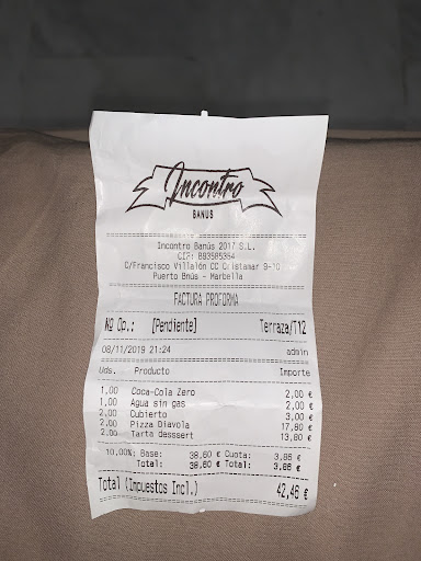 Read moreThis is a simple 'trattoria' in the scheme of things, complete with the inevitable pizza menu. Not in a central 'Banus location. We each had two starters and two main courses, having both chosen the same dish, but only soft drinks, and no desserts. The dry dough bread for me cost €7.60. So the total bill for 2, without service, at lunchtime, was €114. This included vat., which the prices shown on the (very recent)...