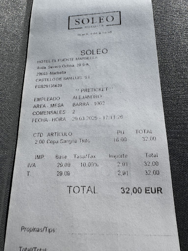 Read moreAfter two days of partying we were looking to chill and to try the beach in Marbella town. If only we managed to get a table or a bed at Soleo. And thank goodness we didn’t. First we were told that beds were only for hotel residents which we found out was a lie because there is a sign that says that non residents can pay €25. We set ourselves on the beach and decided to have a bottle of wine so thought to give the place a second chance. They told us that we could only sit at the bar for drinks (bar being a bench basically). We said that we wanted to sit at a table and there were two girls having orange juice so it was clearly possible. We were told that it wasn’t. So we left and walked along the beach to find Mahiki, gorgeous place with polite staff and nice beds, where we had that bottle AND great food! Bottom line, clearly Soleo is not an actual beach club and staff is really rude and uptight (with no reason, it’s hardly the Ritz Carlton, and Ritz-Carlton staff is lovely by the way). As we are here enjoying our follow-up cocktails at Mahiki, I can’t help thinking that Soleo does not like...