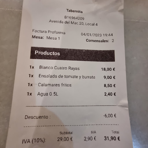 Difficult to find is this Restaurant. The reason is that it is located in a pedestrian area. We have been the only guests when we have arrived at 7:30 p.m. on January, 4th. Inside the Restaurant it is more looking like a Bar. When presenting the menu I have ordered a bottle of White Wine. What a pity that I got informed that the White Wine was not cold. So I needed to change the wine. Then I have asked for fresh = pescado del dia. Only 2 different fishes were offered: Lubina = but we got told that the fish is deep frozen! The other fish what was offered was CALAMARES at a price of 22 € , what we have rejected for that much too high price. Then we got served a plate of Aubergine stripes. After 5 minutes it was taken away because it should be served for other guests. Later we got a smaller portion from the House... The bread from the House was very dry. The Olives were served without a stick or fork. The main course what we have ordered was Burrata on slices of tomatoes. What a pity that the Burrata was not creamy inside like it should be. The other main was CALAMARES FRITOS. The taste was like the CALAMARES got a treatment before similar like with Lemon juice. I don't know about the reason. A very very little portion of Mayonnaisa was added.