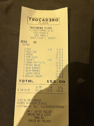 Last 29 July I went to this restaurant for dinner. When I was paying the bill, I put the card in the ATM terminal, but it showed some anomaly and did not issue the payment receipt. Although I told the waiter that the payment had been completed successfully, he insisted repeatedly that it was necessary to repeat the payment because it certainly had not been completed. The waiter quickly went to get another ATM terminal where the payment was repeated and this time the receipt was issued. What happens is that I was charged twice for my dinner. When I realized this situation, I contacted the restaurant via email explaining the situation and asking to be returned the amount incorrectly charged. the restaurant never even deigned to answer my email, or to return the amount charged in excess. This has a name, it's called stealing! In all my life I've never passed through such an unpleasant experience as I had in this restaurant, which takes advantage of tourists to steal money from them by charging several times the amount of the bill. Education, values and ethics are things that money can't buy, even in Marbella where money abounds.