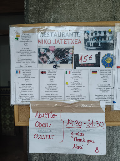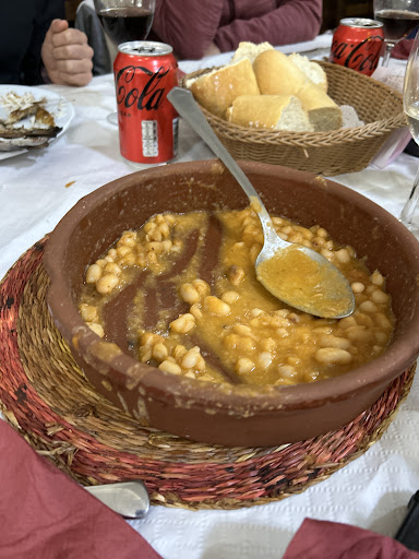 Nos dieron una carta de un menú, de primero pedimos pasta y arroz con marisco. Las pasta era pasta pasta. No se cuanto tiempo llevaba cocido aquello, estaba super inflada y solo con salsa de tomate frito de brik, sin un refritito de nada. Con lo fácil q es pochar una cebollita, pimiento, puerro... ( los q sois cocinillas sabéis de lo q hablo) Y el arroz era puré de arroz literalmente😂! De chiste! Nunca en mi vida he visto un arroz tan pasadísimo! Vimos q entraban gente del pueblo y cual fue nuestra sorpresa? A ellos les dieron otra carta diferente. Le preguntamos a la camarera ( q fue muy amable y comprensiva por cierto)q si había otras cosas de comer y dijo q si pero que nos ofreció el menú solo por nuestra estética de peregrino😱, asi de sincera. Le pedí q por favor retirara esa comida y nos enseñara las otras carta. Bacalao bilbaína, chuletón, chuletitas de cordero, platos combinado bien generosos...eso ya era otra cosa! Y al final lo disfrutamos. Recomiendo al local que enseñe toda su propuesta gastronómica al los clientes sin dejarse influenciar por la estética. Seguramente facturaran mas y los clientes se irán bastante contentos y no con la sensación de haber comido sobras de hace tres días. Bacalao a la bilbaína y solomillo de...