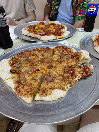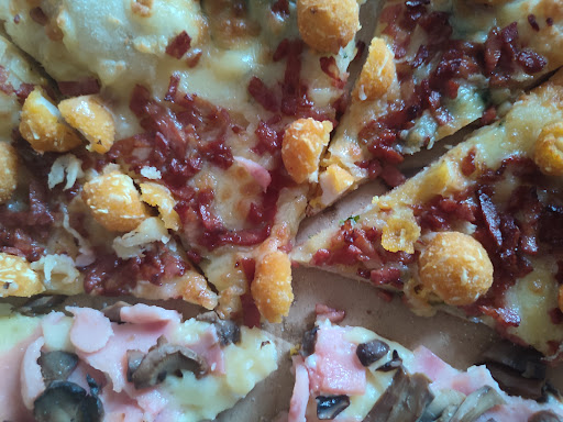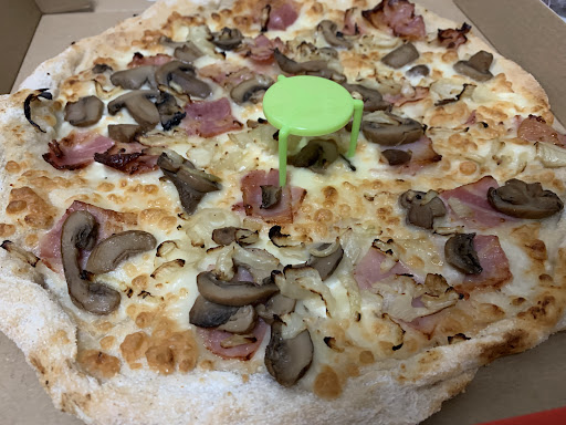 Hicimos el pedido, pedimos a otro chico (hasta 3 veces) si podía darnos un trapo para limpiar una mesa sucia y a la tercera y sin mediar palabra, como molesto por hacerle trabajar, pasó la bayeta. Mientras el primer chico parecía ser el único en estar trabajando, dentro hasta 8 personas de risas, cantando en alto la música que parecían tener puesta en su móvil (porque en un momento dado salieron todos para afuera y la música empezó a cortarse), y en concreto uno de ellos de pelo canoso de cachondeo con dos chicas vestidas de calle era el que parecía hacer las pizzas. ¿Resultado? No han visto un círculo en la vida. Véase la foto (y así todas). Los cartones para poner los trozos de pizza ni están ni se les esperan.
