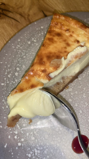 De postre pedimos “LA LIGERA” con helado casero de vino y manzana (6,90€), una de las mejores tartas de queso que he probado 💛