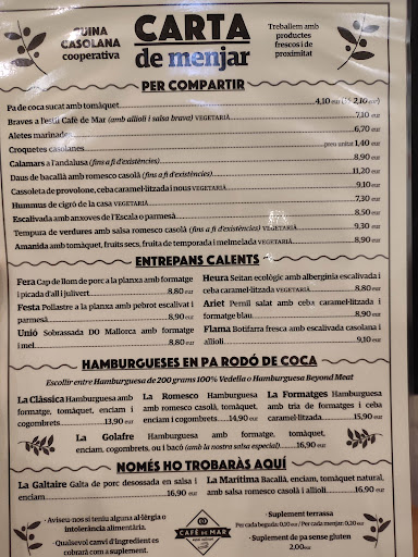 Read moreEl Cafè de Mar és un local històric de Mataró. Des dels inicis (1930 i abans) ha funcionat en règim de cooperativa. Durant el franquisme va romandre tancat, però s'ha recuperat i ho torna a portar una cooperativa. Alguns dies a la nit hi intervenen grups musicals o es fa altres menes d'actuacions culturals. Nosaltres hi hem anat sempre al vespre i hem menjat d'entrepà, ni ha molts i variats, freds i calents, per actors els gustos. La qualitat és bona, no et posen qualsevol pa. Però si es vol hi ha altres coses per menjar. El lloc és nét, l'ambient és bo, i de vegades s'ha de reservar perquè...